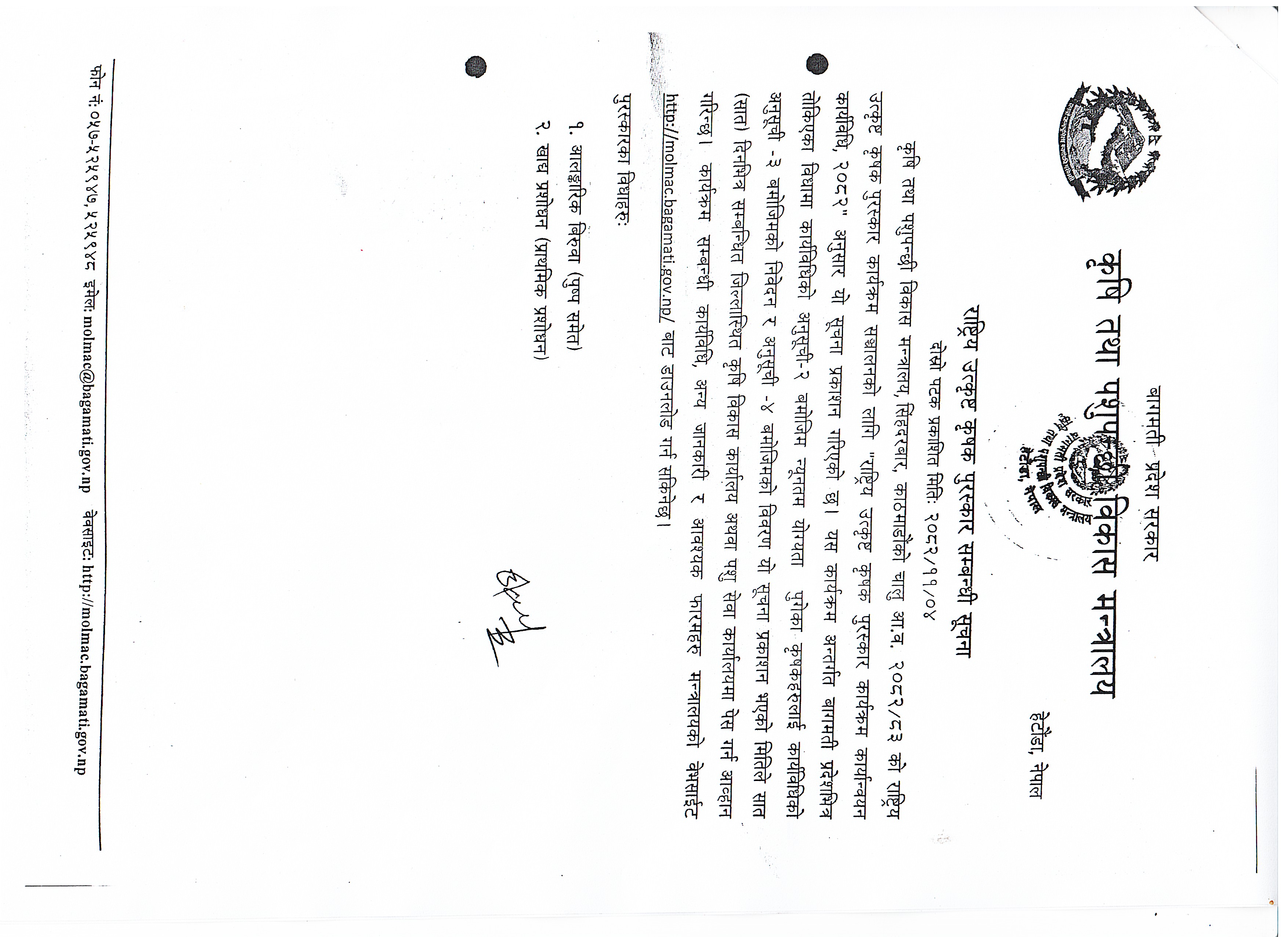 कृषि विकास निर्देशनालय, बागमती प्रदेशको आधिकारिक वेबपेजमा स्वागत छ । कृषि नेपाली अर्थतन्त्रको प्रमुख क्षेत्र हो । यसले कुल जनसंख्या को ६६ प्रतिशत रोजगारीको अवसर प्रदान गर्दछ र जीडीपी करिब २७ प्रतिशत योगदान छ । त्यसैले, कृषि क्षेत्रको विकास र राष्ट्रिय अर्थतन्त्रको विकासका लागि महत्वपूर्ण छ। >> See More >>
